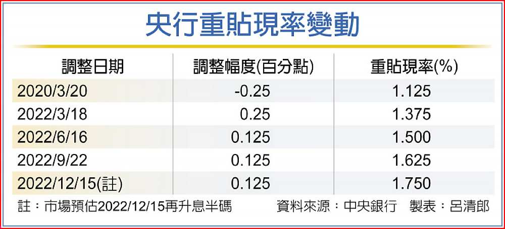 今年最後一場升息大戲12月15日登場,近來放出鴿聲的聯準會(Fed),當天凌晨發布利率決議後,下午中央銀行年終第四季理監事聯席會議緊接著舉行,無縫接軌做出最妥適的政策因應,市場預料將四度升息、幅度半碼(1碼是0.25個百分點),重貼現率上揚至1.75%,維持「緊縮到年底」的基調。