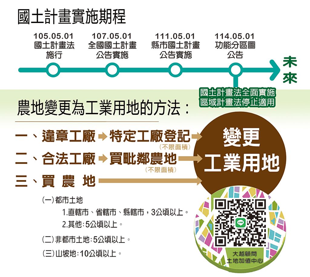 (國土計畫實施時程與農地變更工業用地辦法。圖/業者提供)